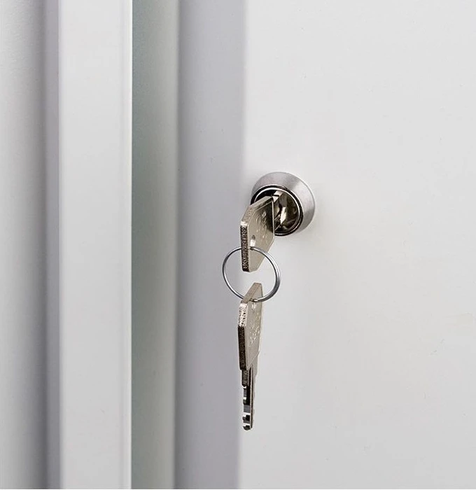 - На двери установлены ключевые замки «Практик». Когда замок заперт, дверь удерживают в закрытом состоянии магнитные защёлки.
