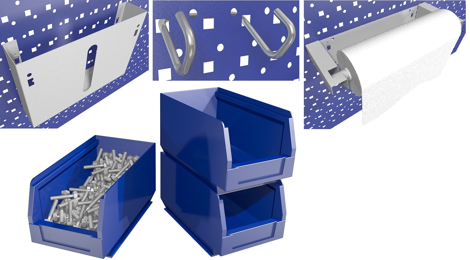 Пополнен ряд аксессуаров на экраны к верстакам, инструментальным шкафам, тумбам и инструментальным тележкам. Теперь, помимо основного набора – различного вида полок и держателей для инструментов, – вы можете приобрести удобные лотки для различных бумаг, журналов, справочников и т.п., держатель для весьма полезных в процессе работы рулонных полотенец, а также разного вида и размера крючки и компактные пластиковые ящики для мелких грузов, метизов и запчастей.